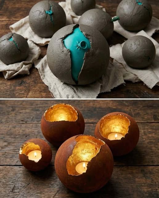 Suchen Sie ein einzigartiges, auffälliges DIY-Projekt, das einfache Materialien in elegante Wohnaccessoires verwandelt? Dann sind diese Kerzenhalter aus gesprungenen Kugeln genau das Richtige für Sie. Mit ihrer natürlichen, erdigen Optik und dem schimmernden Metallinneren schaffen sie ein warmes und luxuriöses Ambiente – perfekt für gemütliche Abende, romantische Dinner oder als stilvolle Akzente in Ihrer Wohnung.