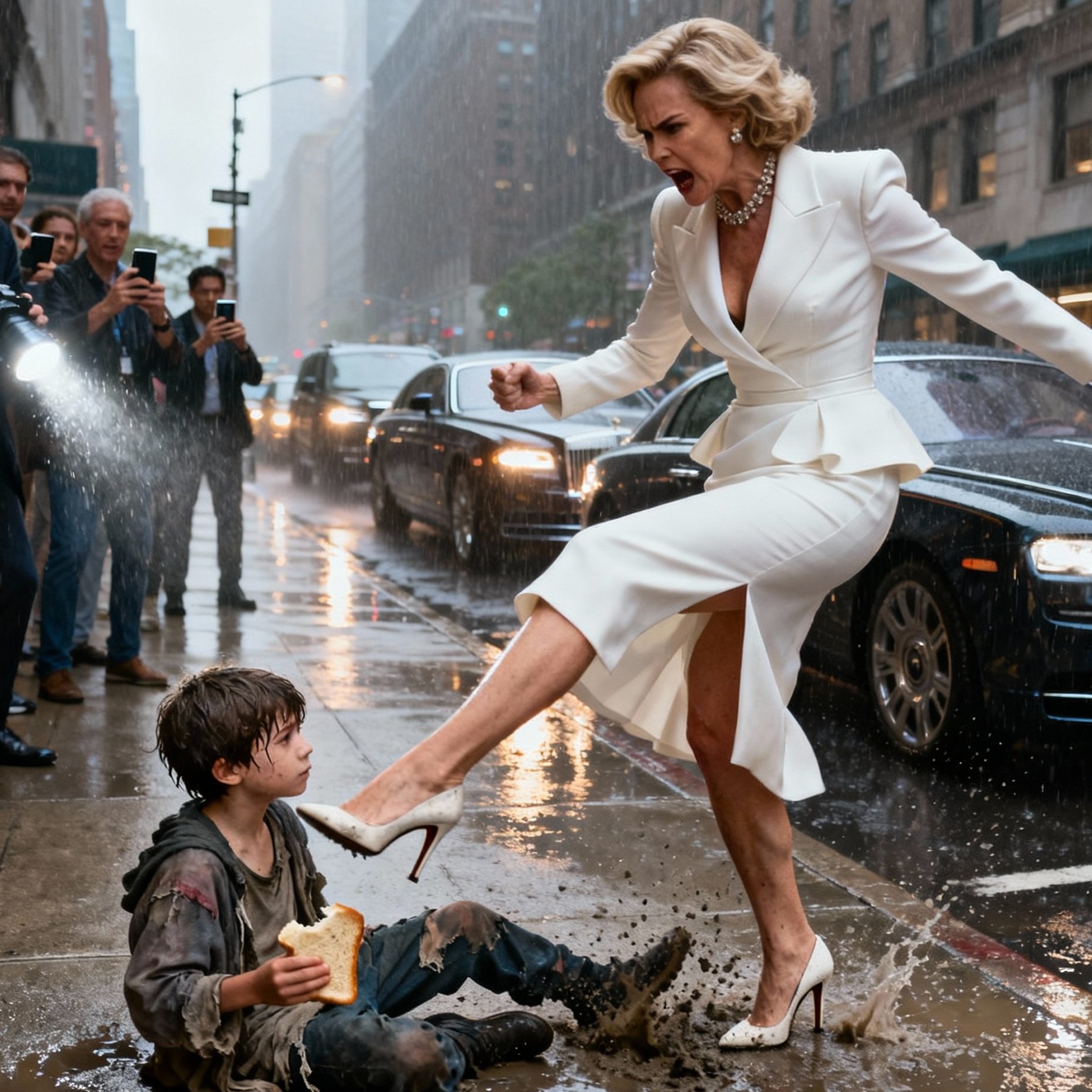 Es brach ein lautes Keuchen aus. Kameras klickten. Die Milliardärin, deren Image auf „Eleganz und Anmut“ beruhte, wurde nun dabei gefilmt, wie sie ein obdachloses Kind schubste.