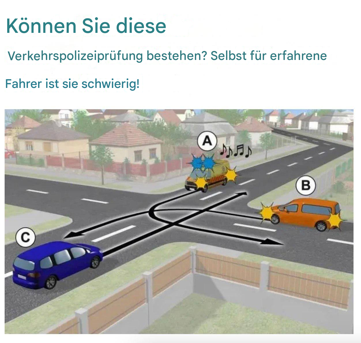 Viele erfahrene Fahrer, die schon seit Jahren am Steuer sitzen, würden beim Blick auf das untenstehende Diagramm selbstbewusst behaupten, die Antwort auf die Frage zu kennen. Doch bei genauerem Hinsehen merken sie schnell: Ups, so einfach ist es doch nicht, obwohl es sich um eine ganz alltägliche Verkehrssituation handelt.