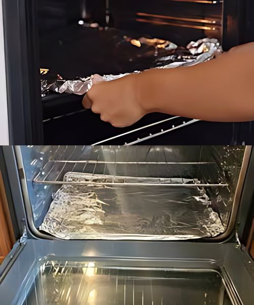 Breiten Sie anschließend ein Stück Aluminiumfolie auf den Wänden, dem Boden und dem Glas des Ofens aus. Das Aluminium bleibt sofort am Wasser haften.