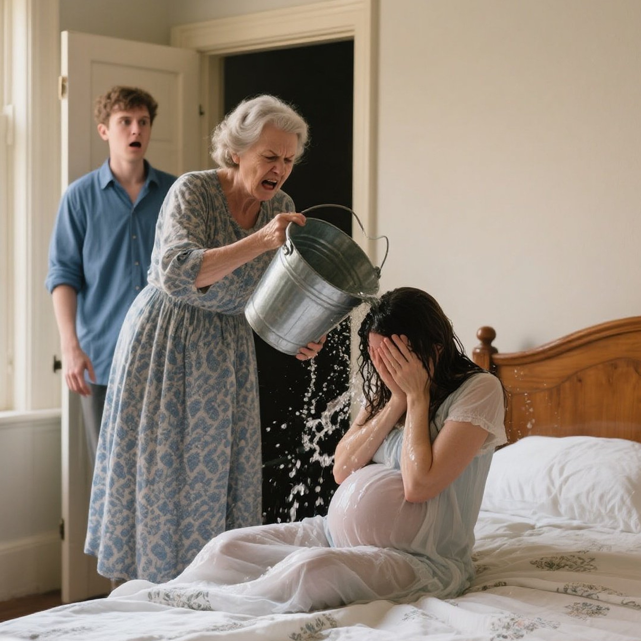 Das Geräusch folgte eine Sekunde vor dem Schock. Eiskaltes Wasser ergoss sich über Olivia Bennetts Körper und durchnässte ihren Pyjama, ihre Haare und die Bettlaken. Sie keuchte auf und richtete sich verwirrt und entsetzt auf. Ihre Hände zitterten, als sie sich das Wasser aus den Augen wischte und zu der Frau aufblickte, die einen leeren Metalleimer hielt – ihrer Schwiegermutter Eleanor Bennett .
