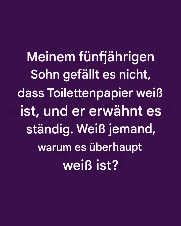 Kinder sind von Natur aus neugierig und bemerken oft Details, die Erwachsene übersehen. Die Faszination meines Sohnes für die Farbe von Toilettenpapier rührt wahrscheinlich von seinem sich entwickelnden Verständnis der Welt und seinem Wunsch her, den Status quo in Frage zu stellen. Für ihn ist das einheitliche Weiß von Toilettenpapier eine Anomalie im Vergleich zu den leuchtenden Farben, die er in anderen Bereichen des Lebens sieht. Seine Neugier bietet ihm die Möglichkeit, ein profanes Thema mit frischen Augen zu erkunden und die Gründe für diese alltägliche Entscheidung aufzudecken.